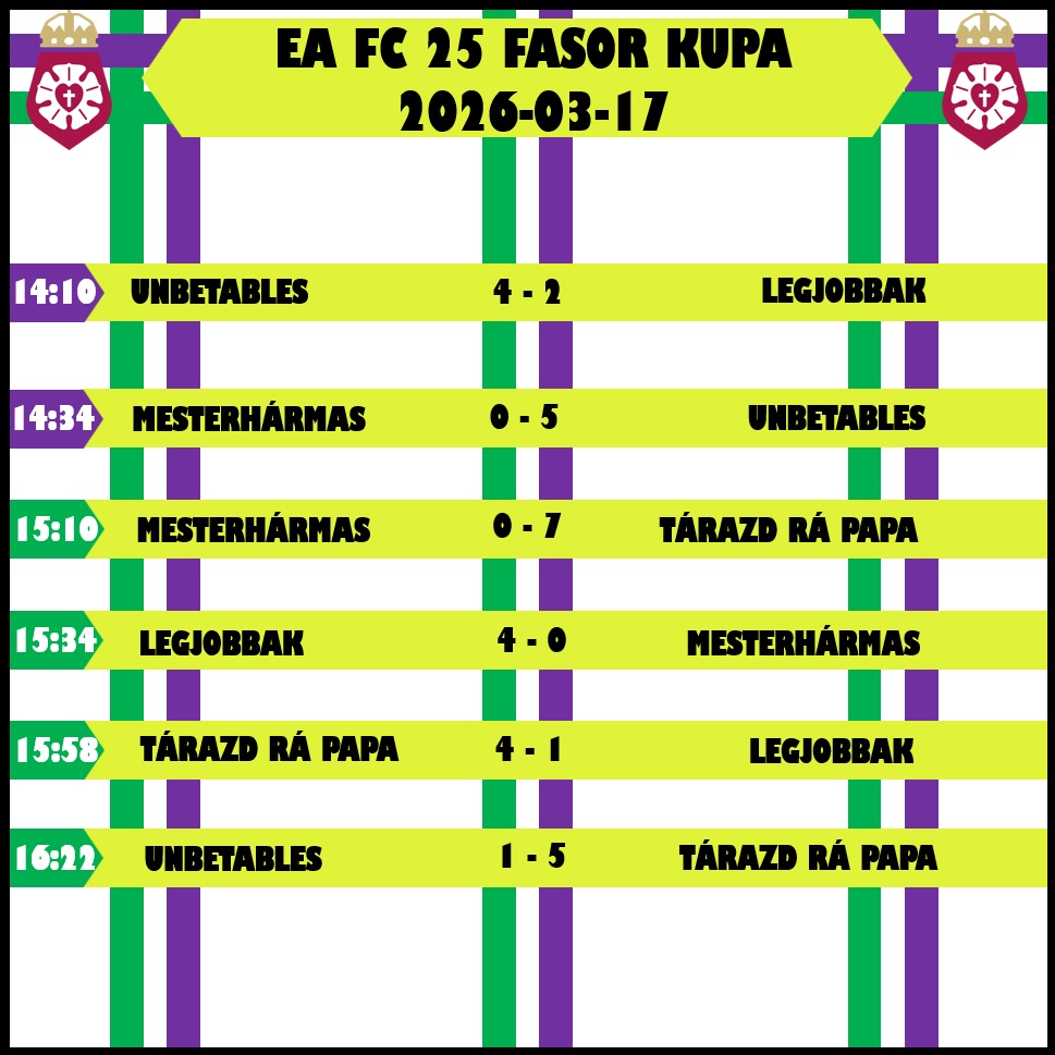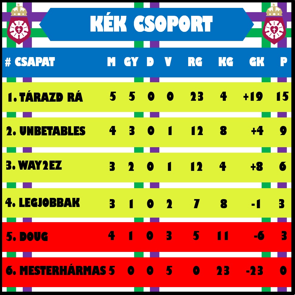 1. Több szerzett pont, 2. Jobb gólkülömbség, 3. Több lőtt gólEtikett, eszközök: Csak a szervezők által biztosított kontroller használható, A mérkőzést minden csapat köteles végigjátszani. A gólörömöt skippelni kötelező.