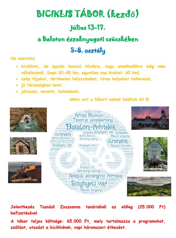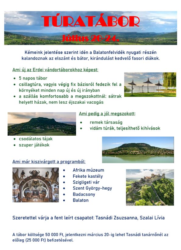A tábor költsége 50 000 Ft, jelentkezni március 20-ig lehet Tasnádi tanárnőnél az előleg (25 000 Ft) befizetésével