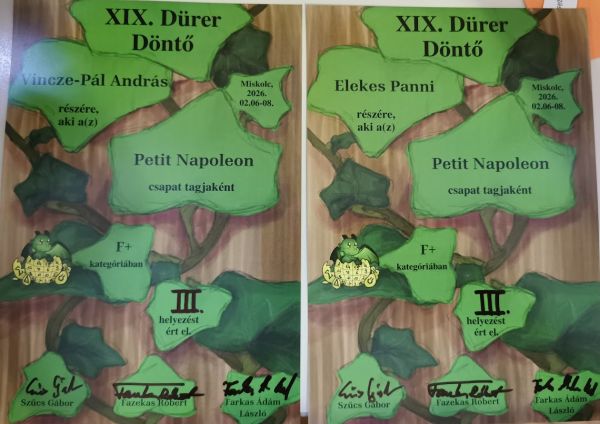 Az idei Dürer Verseny országos döntőjének F+ (A legmagasabb szintű fizika) kategóriájában Elekes Panni 11.b és Vincze-Pál András 12.b osztályos tanulóink 3. helyezést értek el.